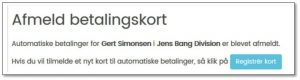 På kontingent-mailen står der ”Du kan betale denne faktura med et andet kort eller skifte betalingskort permanent på [Link til kortregistrering]”. Følger du linket kommer du ind på siden hvor betalingskortet registreres (som vist ovenfor). Når du har registreret kortet, vil du se at knappen Registrer kort har skiftet navn til Skift kort. Ved klik på dette kommer du også til kortregistrerings siden og kan ændre dine kortoplysninger. Der er også tilføjet en knap Afmeld kort, se nedenfor