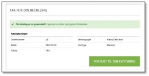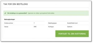 Klikker du på Fortsæt din bestilling ser du en kvittering: