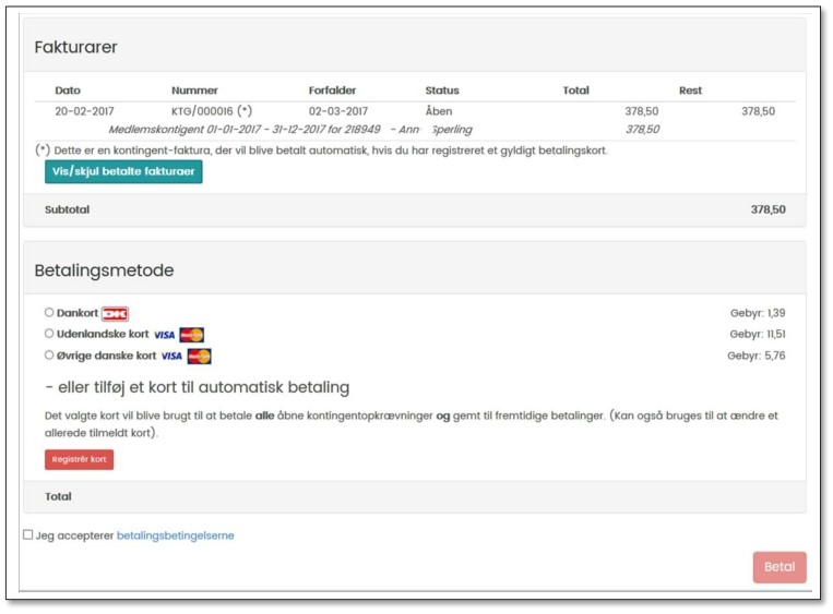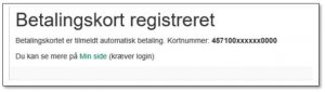 Bemærk: Ved registrering af betalingskort trækkes det skyldige beløb på forfaldsdato, og altså ikke med det samme.