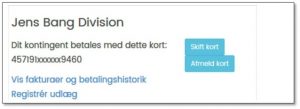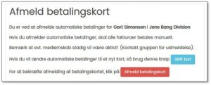 På kontingent-mailen står der ”Du kan betale denne faktura med et andet kort eller skifte betalingskort permanent på [Link til kortregistrering]”. Følger du linket kommer du ind på siden hvor betalingskortet registreres (som vist ovenfor). Når du har registreret kortet, vil du se at knappen Registrer kort har skiftet navn til Skift kort. Ved klik på dette kommer du også til kortregistrerings siden og kan ændre dine kortoplysninger. Der er også tilføjet en knap Afmeld kort, se nedenfor